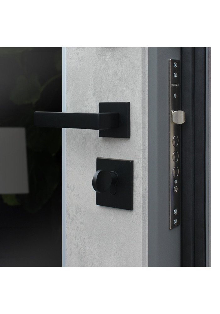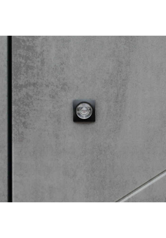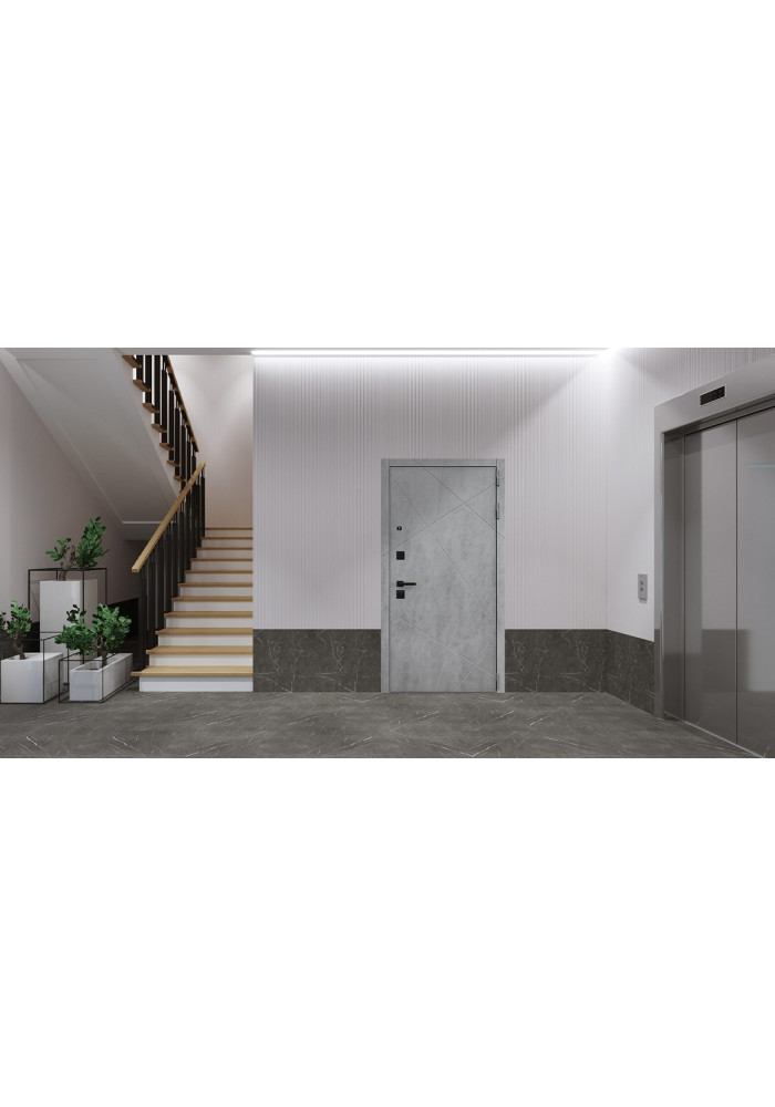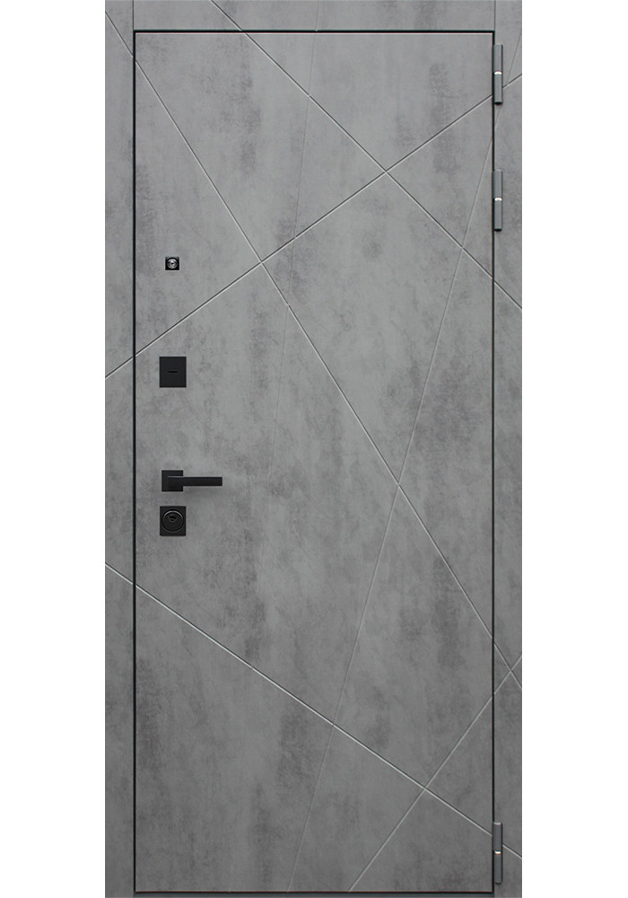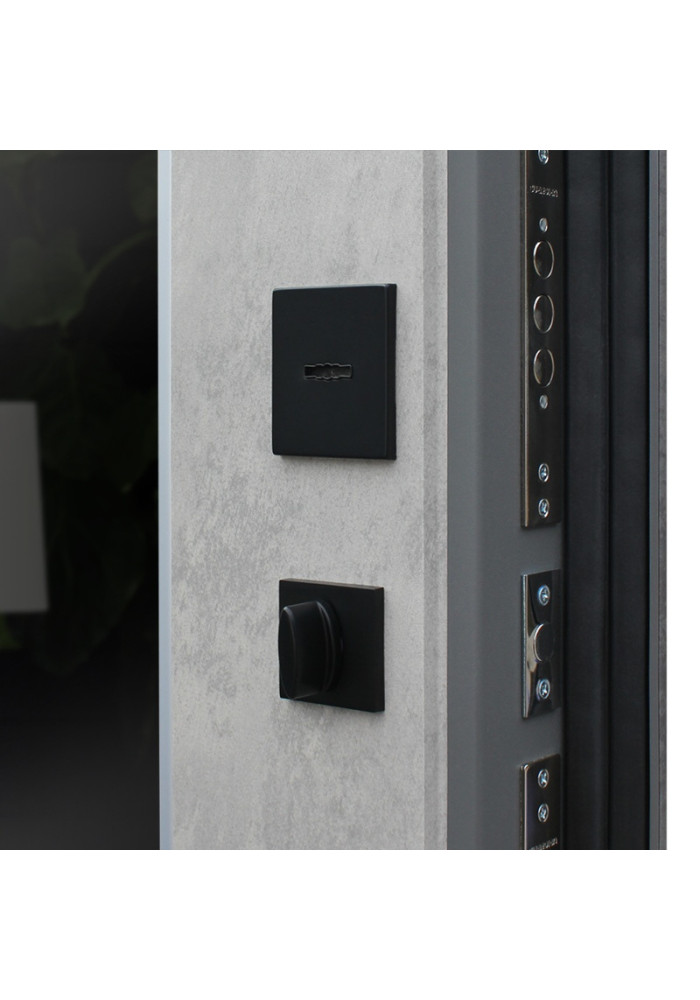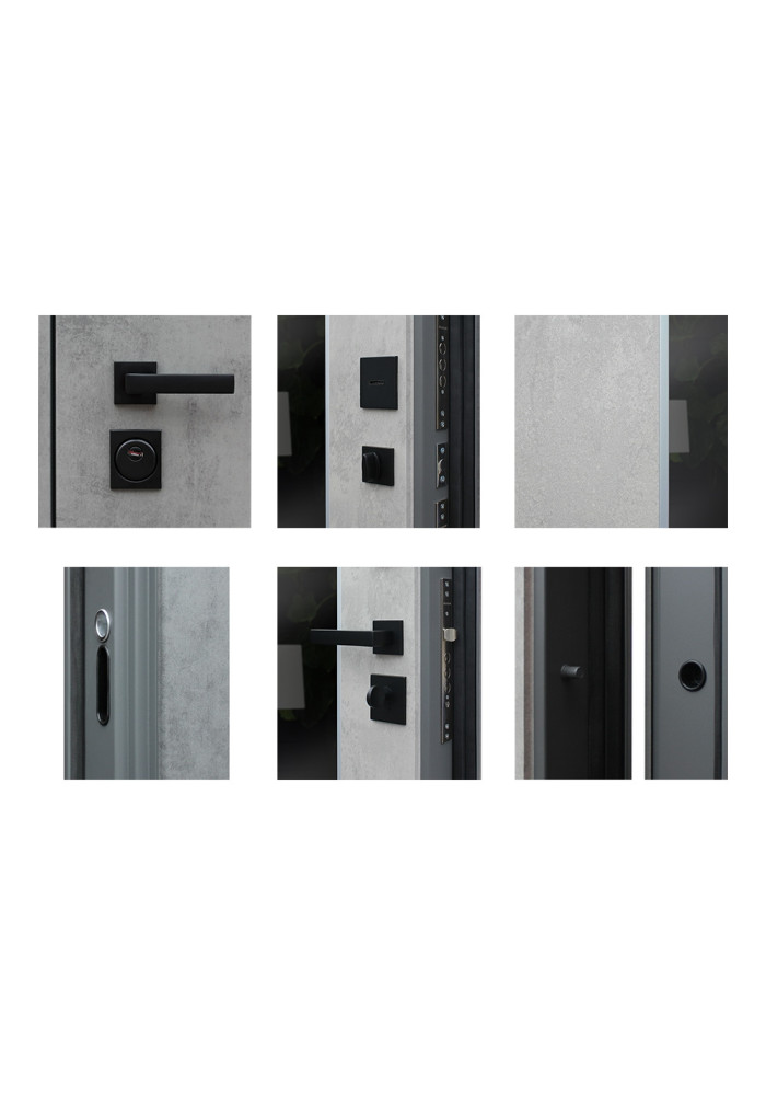 - Наружный лист металла: Лист металла 1,5 мм. Экошпонированная панель МДФ 10 мм. Объемная фрезеровка. Цвет "бетон темный". Наличник МДФ 80 мм с фрезеровкой.